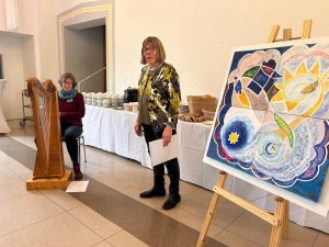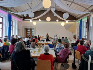 Am Samstag, den 31. Januar 2026 hat der Regionale Hospizverein zum Neujahrsempfang in den Jugendhof Rotenburg zum Brunch eingeladen, um sich bei den zahlreichen ehrenamtlichen Hospizbegleiter/innen und auch bei den Menschen, die diese Arbeit seit Jahren unterstützen, zu bedanken. Etwa 60 aktive Ehrenamtliche und Unterstützerinnen folgten der Einladung. Begleitet wurde der Tag durch die Beiträge von Dichterin, Lektorin und Kunsttherapeutin Regine Plass, die in Verbindung mit einem Bild, das einen zyklischen Prozess der Erneuerung symbolisierte, Gedichte vortrug, unterstützt wurde sie dabei durch meditative Harfenmusik von Musiktherapeutin Irene Lochner. Dieses stimmungsvolle und stimmige Zusammenspiel hinterließ eine bedeutsame sphärische Wirkung, denn es ging auch darum, immer wieder neu zu Kräften zu kommen, Verbundenheit zu stärken, Sonnenstrahlen für die Seele zu sammeln und eine neue Strahlkraft zu entwickeln, die nach innen und nach außen wirkt.